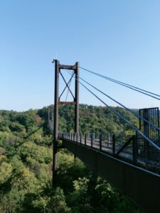 吊り橋に辿りつくまでにひたすら階段を上るという、普段運動していない私にとっては過酷な道のりとなりました… そして汗だく 吊り橋からの景色は良かったですが紅葉は進んでおらず、見事な緑色でした。吹く風には秋を感じれたと思ってます。